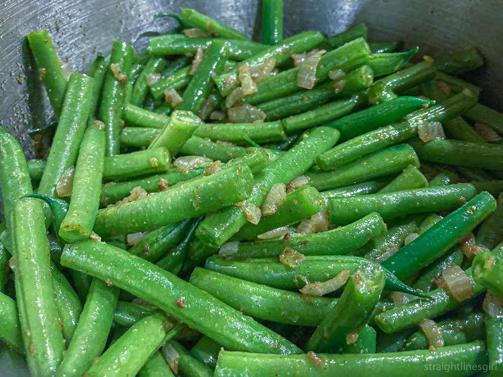 Green beans cooking with onion and garlic