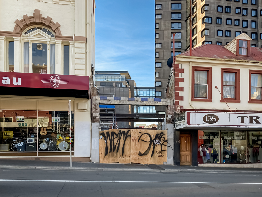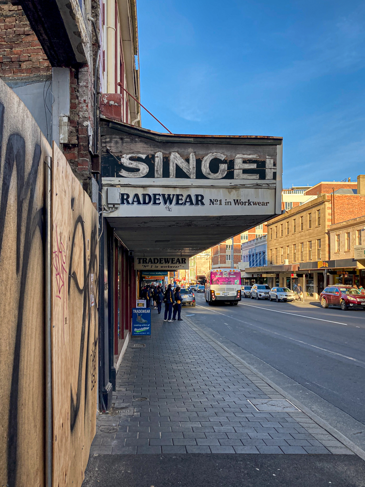 What I thought was really cool about this (if there can be anything cool about demolishing an unobtrusive little building) is that removing the McCann’s awning has revealed the previously hidden top of the awning next door at 135 Elizabeth Street. It’s currently Tradewear, but was obviously previously a Singer sewing machine store.