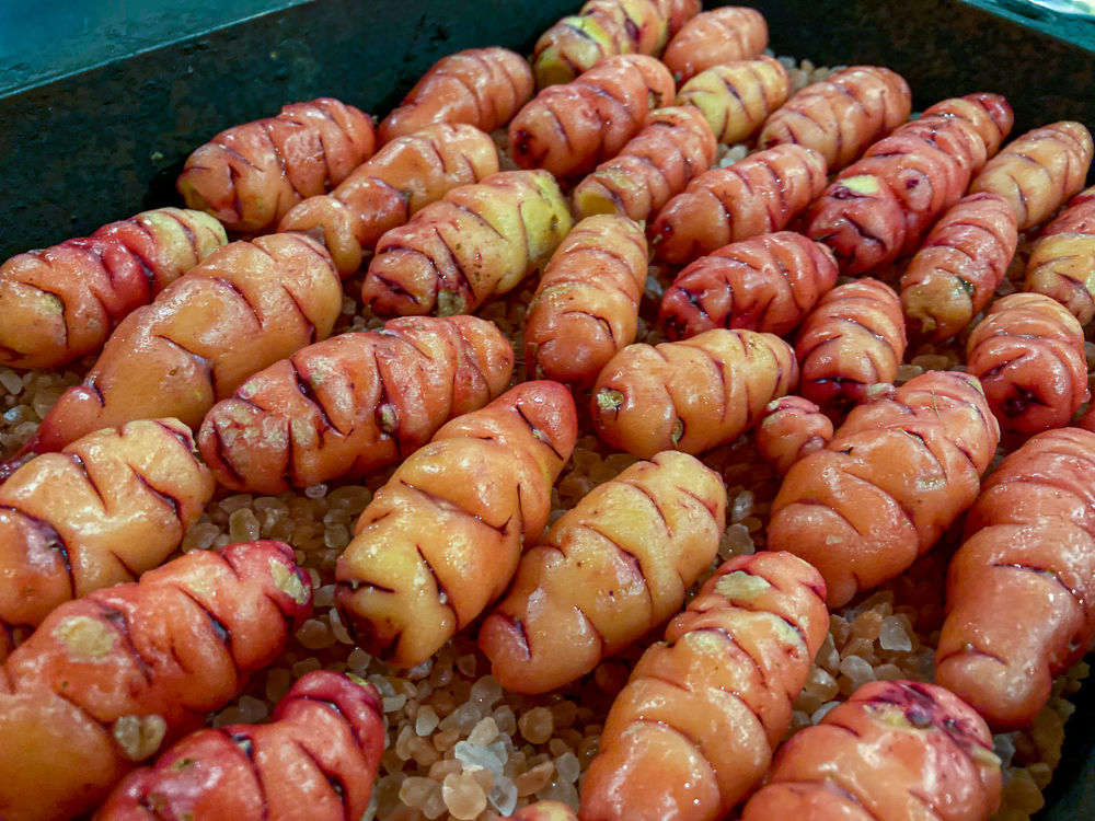According to Alice, you’re supposed to soak them in water for 20 minutes and scrub them with a vegetable brush before cooking them. I, of course, hadn’t read this section, and as the yams looked pretty clean I just rinsed them and scraped off any dodgy looking bits.