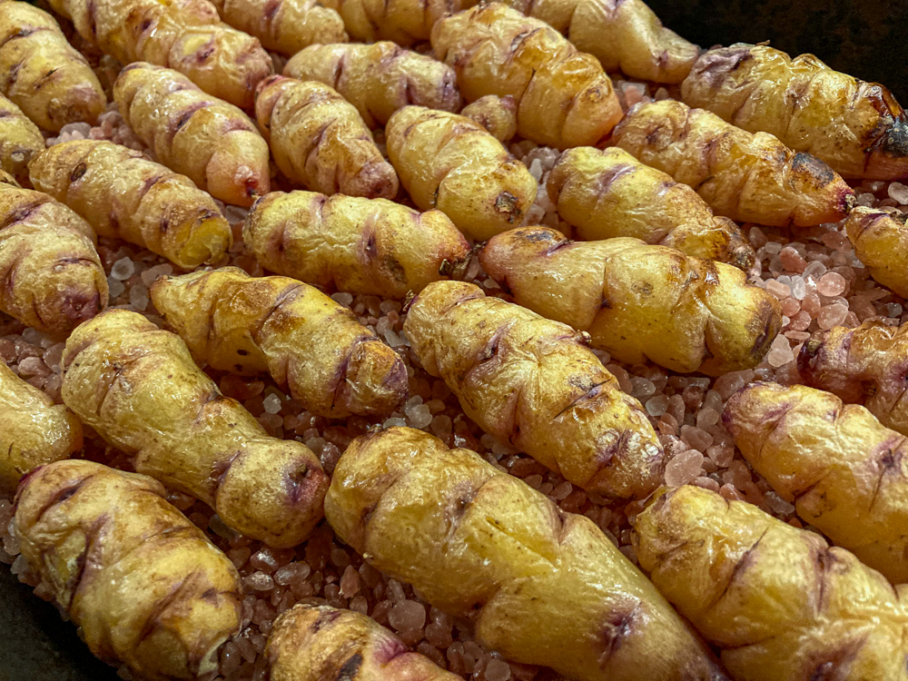 She says that roasting them on salt “draws the water out and intensifies the texture so you’re leaved with the chew of chicken, with the lightness of fish”. Sounds intriguing.