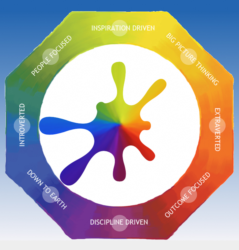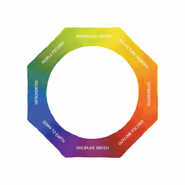 As you start to move around the circle, around the traits, the colours change too. So moving clockwise from blue, you go through blue-green to green (the people-focused energy) to yellow-green and then to yellow (the imagination, big picture energy, which sits diagonally opposite blue). Keep going and you move through extroverted orange to red (the outcomes-focused energy), then the red-purple, disciplined purple and back to blue.