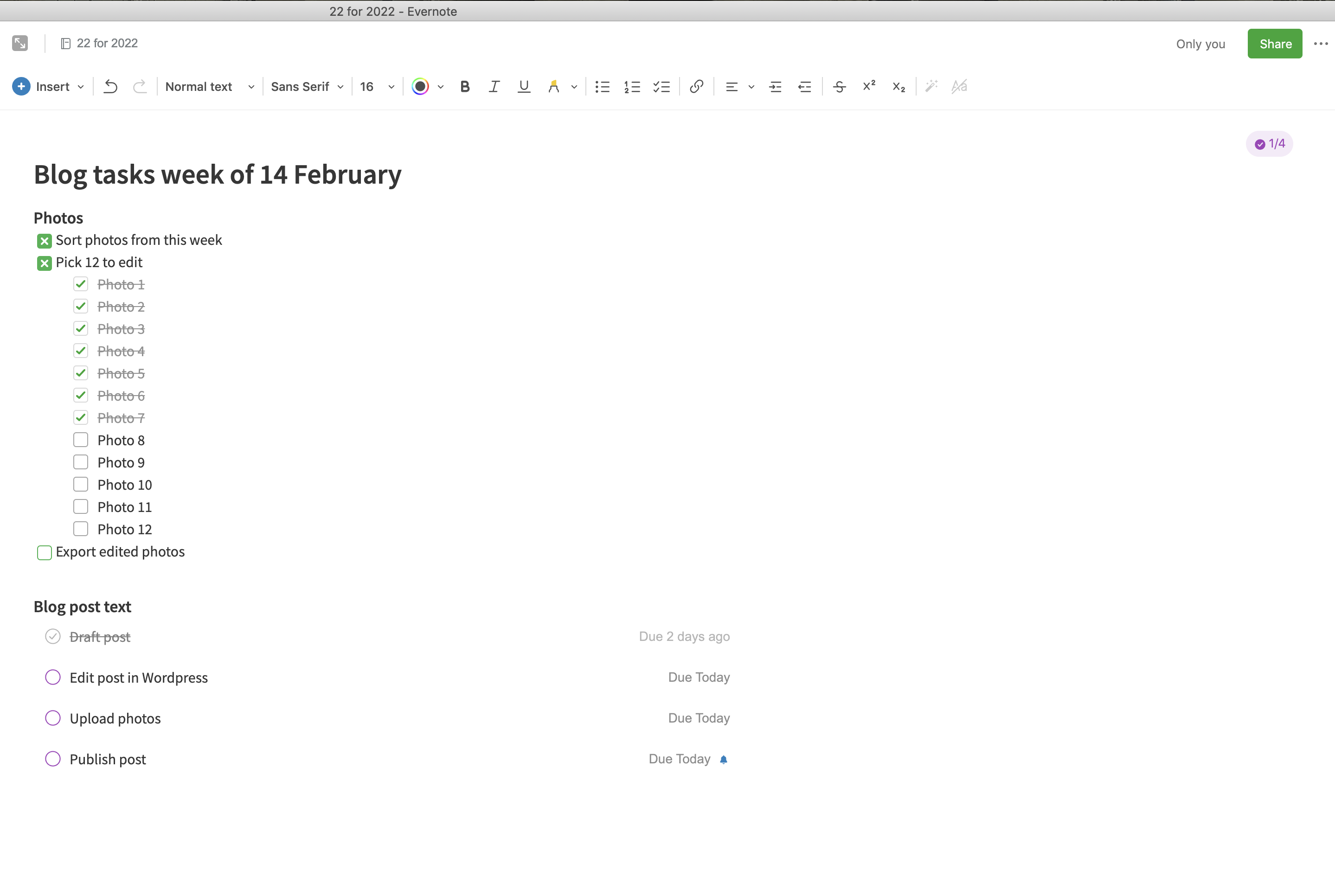 This is working really well for the project that I’m currently working on that is fast moving and where tasks need to be added to the list quickly and get completed quickly. Sometimes they don’t seem worth adding to Todoist because 20 minutes after I’ve added them, they’re done, and if I add them to Todoist I have to switch between tools. Using Evernote means I can add things quickly, check them off quickly and see what still needs to be done at a glance, all in the same place.
