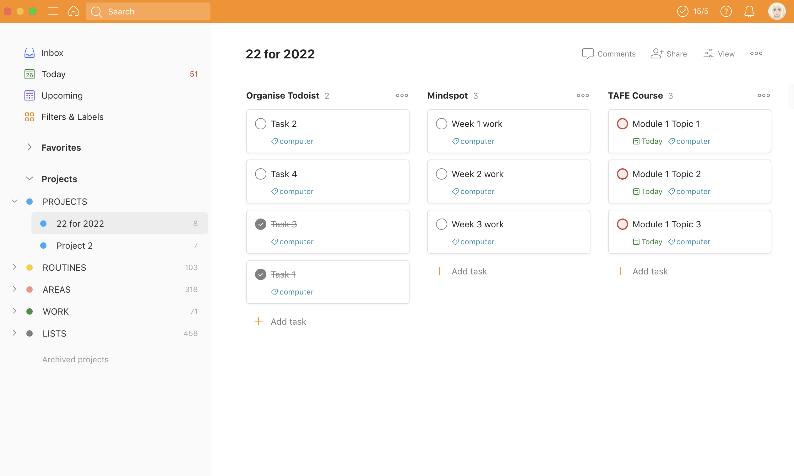 In Todoist, you can set up projects (and sub projects) for your tasks. Remember that a task within a project is a single action that you can check off as complete when it’s done. “Go to Queensland for a holiday” is a project. “Book plane tickets” is a task.