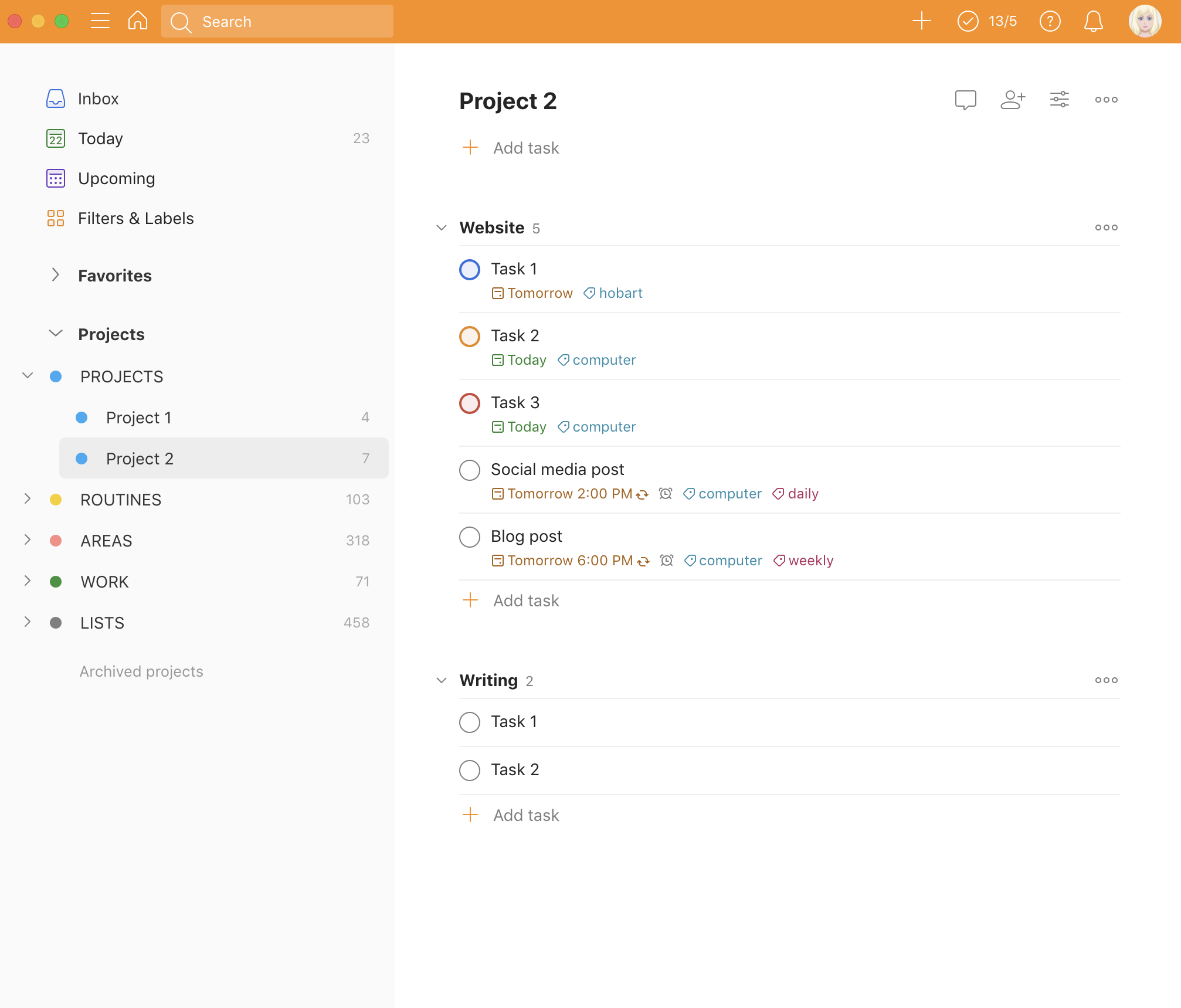 This can be powerful if you also give your tasks due dates and assign priorities, as in the premium version of Todoist, you can use filters to refine what you see.