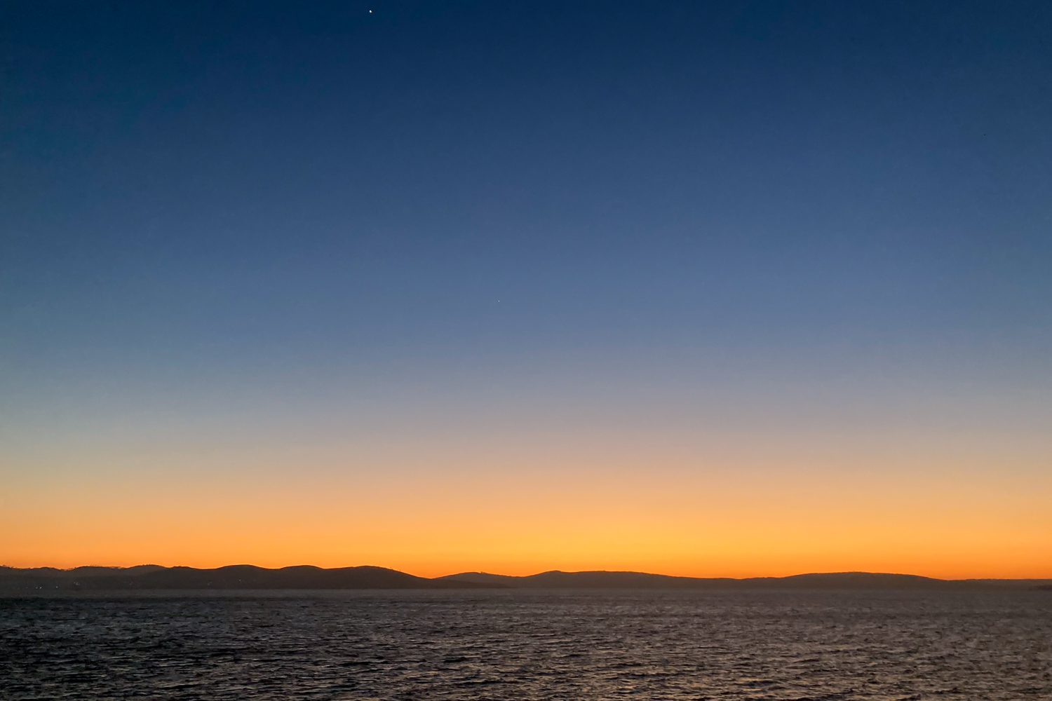 A pre-sunrise sky with an orange glow over the river