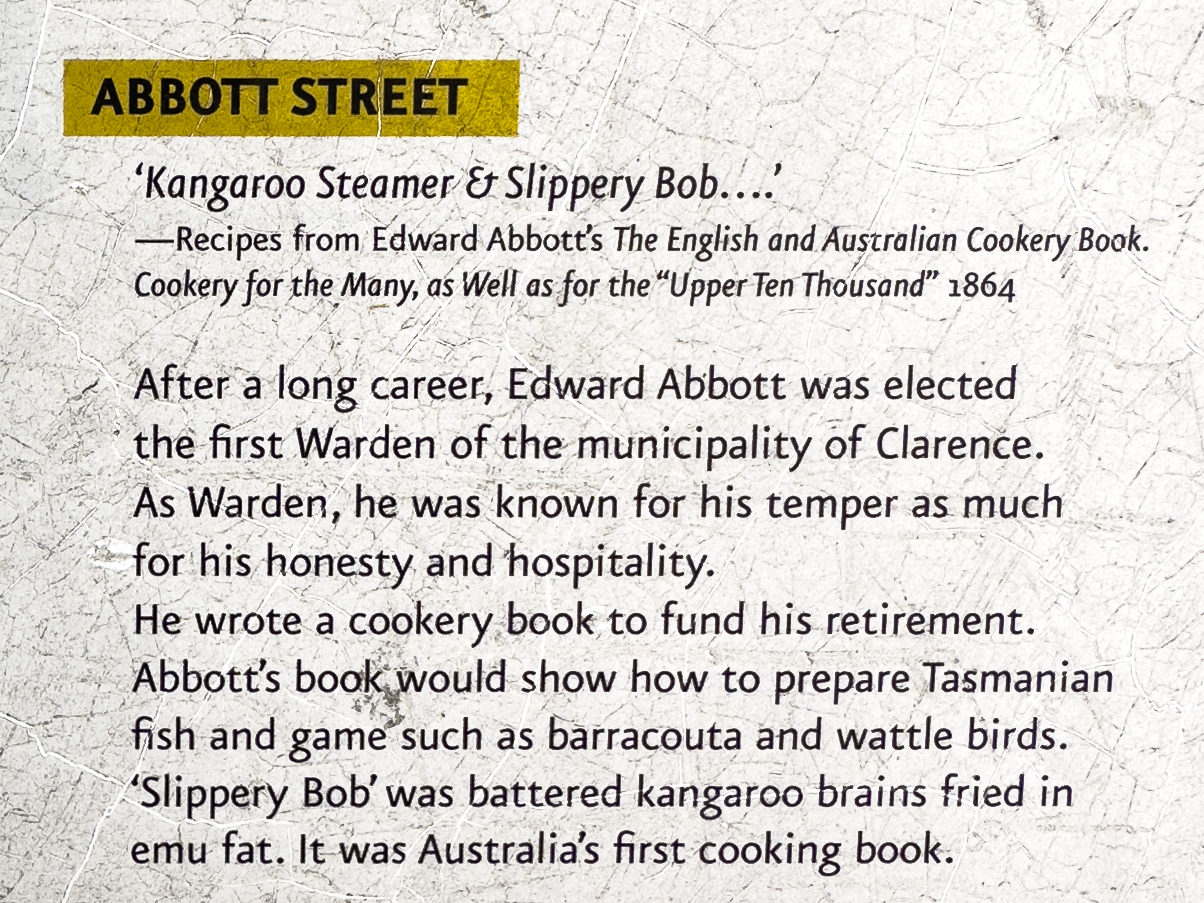 According to a sign near the Bellerive Wharf that gives origins of some of the area’s street names, Mr Abbot wrote a cookery book to fund his retirement. This was Australia’s first cooking book.