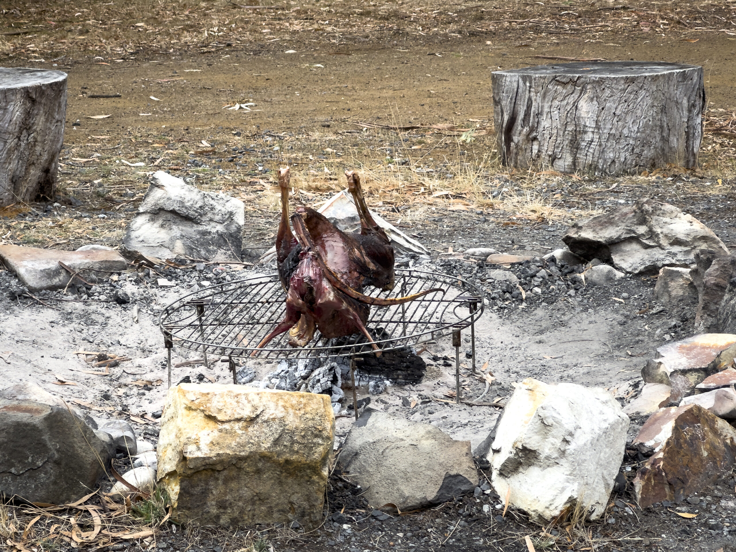 At the end of this time taking in the music, Nunami’s words and her art works, we were invited to share some food created by Kitana Mansell of Palawa Kipli, which included wallaby that had been roasting over the coals when we arrived.