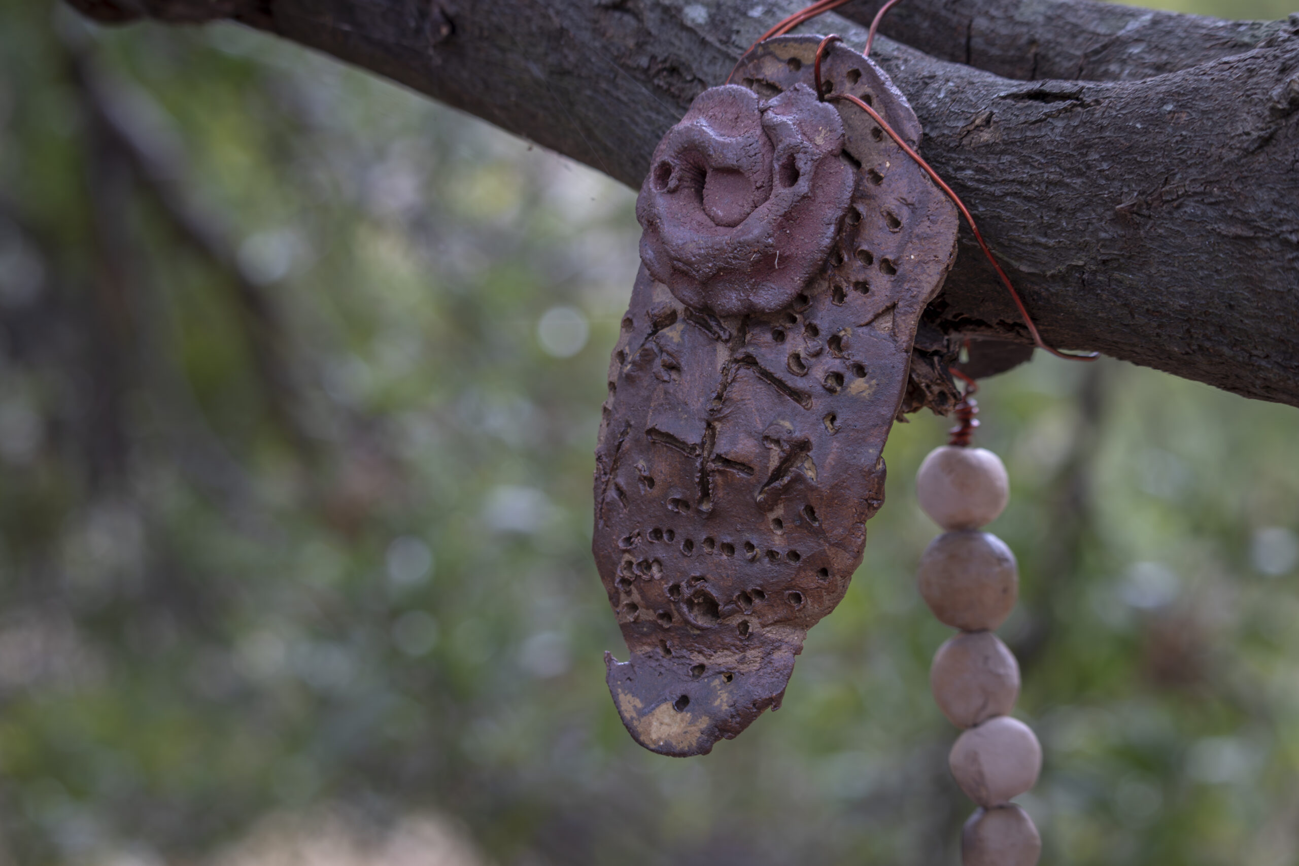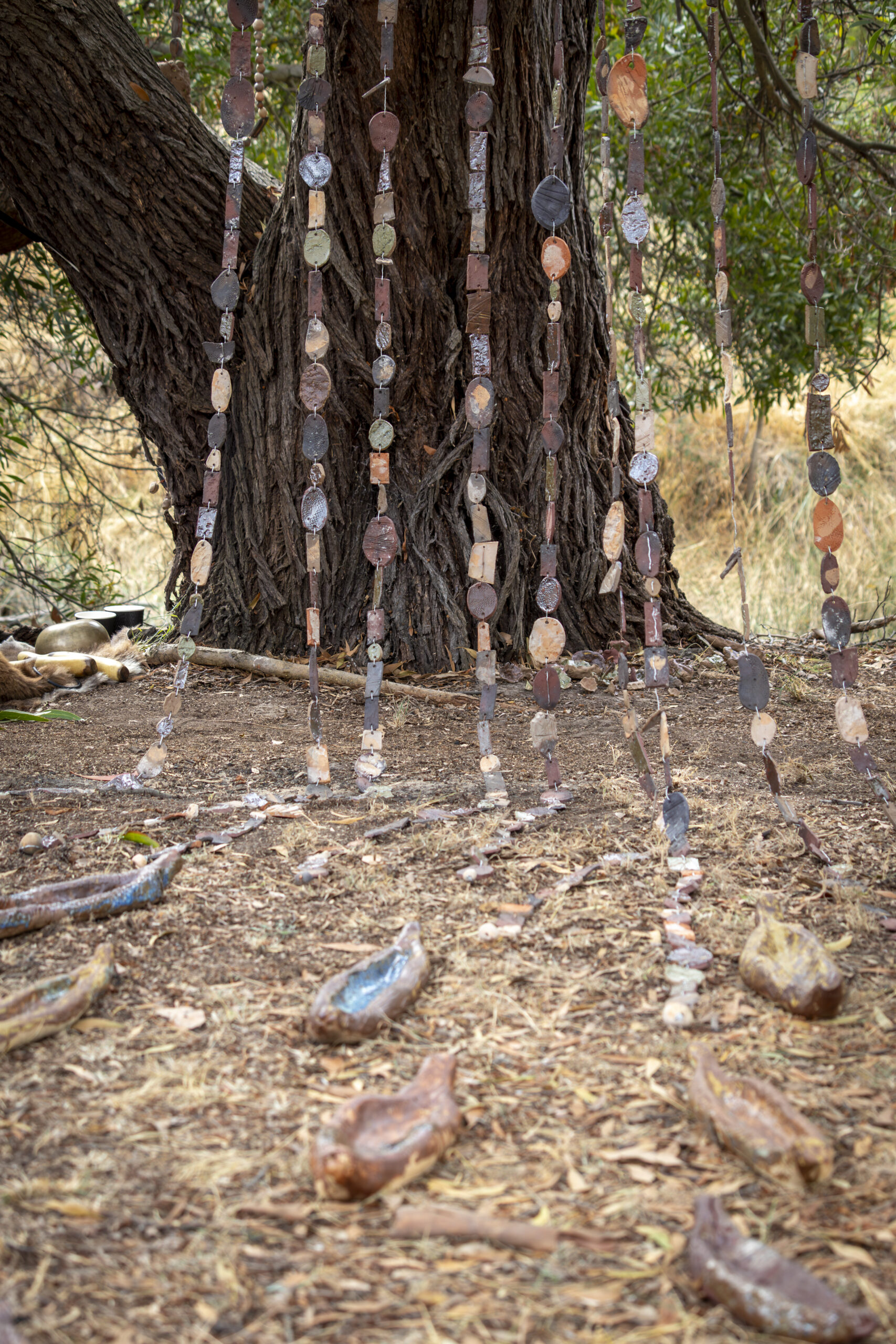 Here we see Nunami’s beautiful wind chimes that she’s arranged in a way that brings to mind a waterfall, and on the ground, she has laid 47 canoes that represent the 47 Palawa relocated from Wybalenna on Flinders Island to Putalina/Oyster Cove.