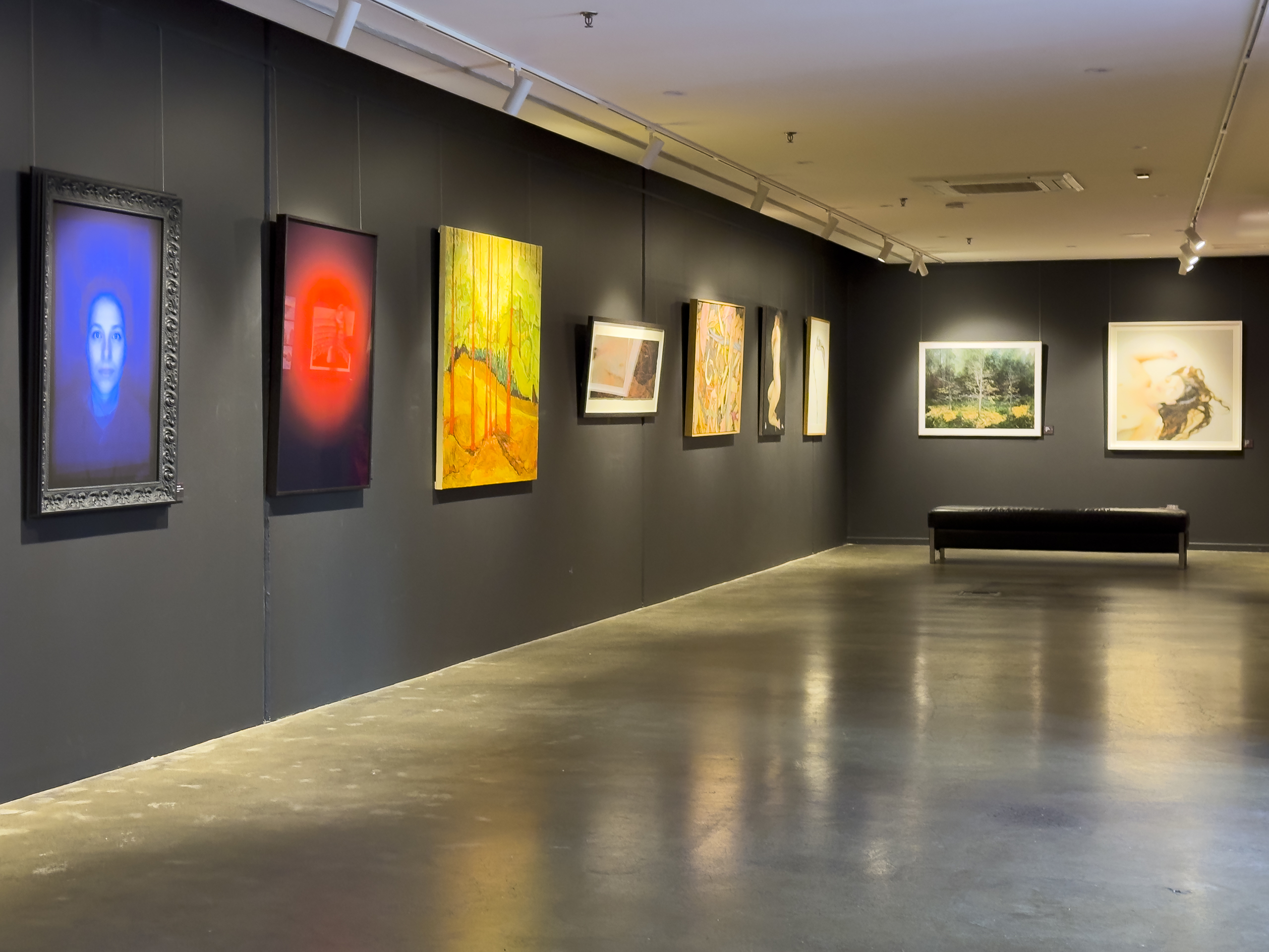 A sculpture of three people walking, and a large red 01. A sculpture of a hand with a face built into it is on top of the roof of a building in the background.