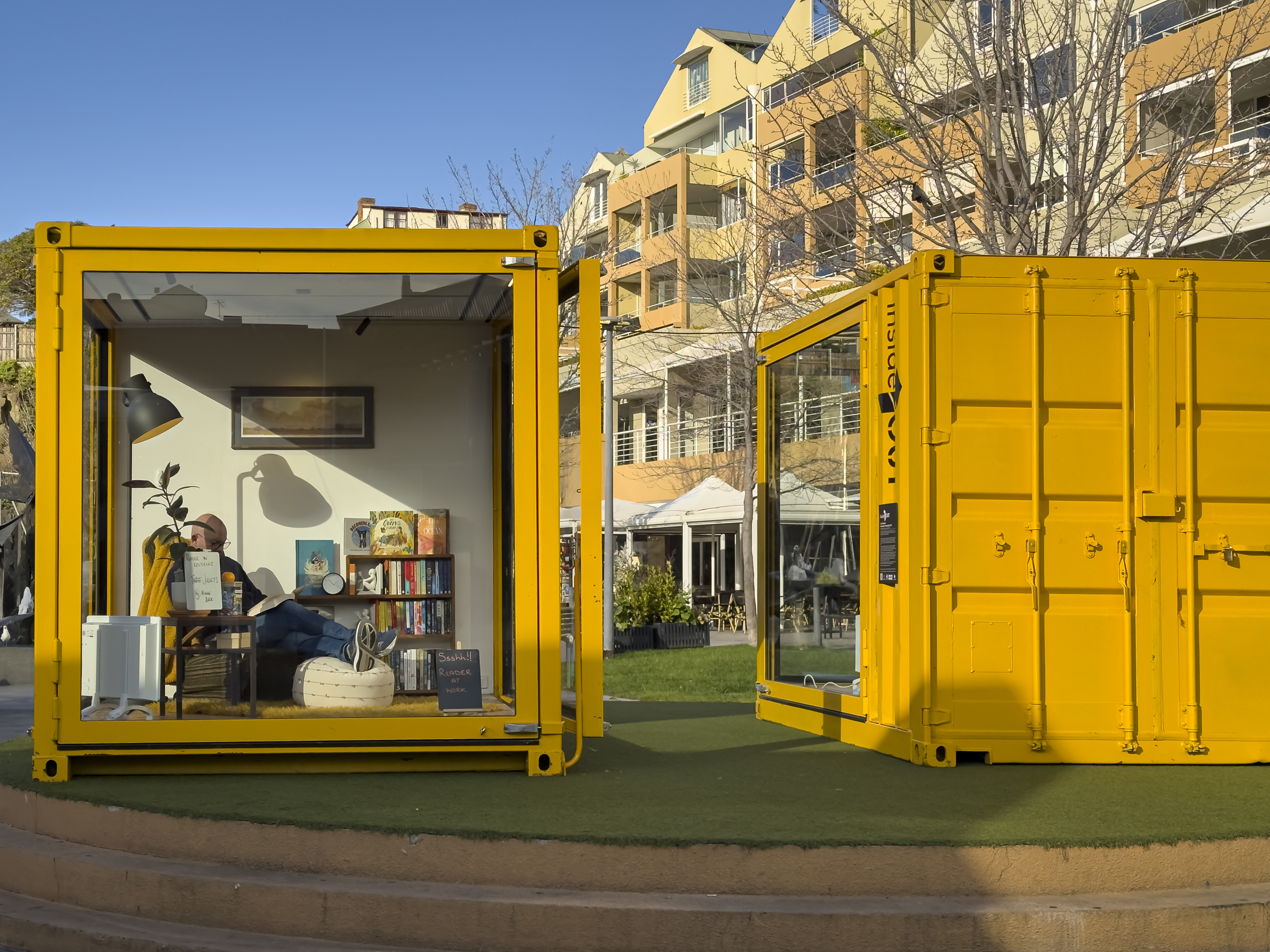 Two yellow cubes in an open space. There is a glass front on one cube and a person is sitting inside, on a big armchair, reading a book.