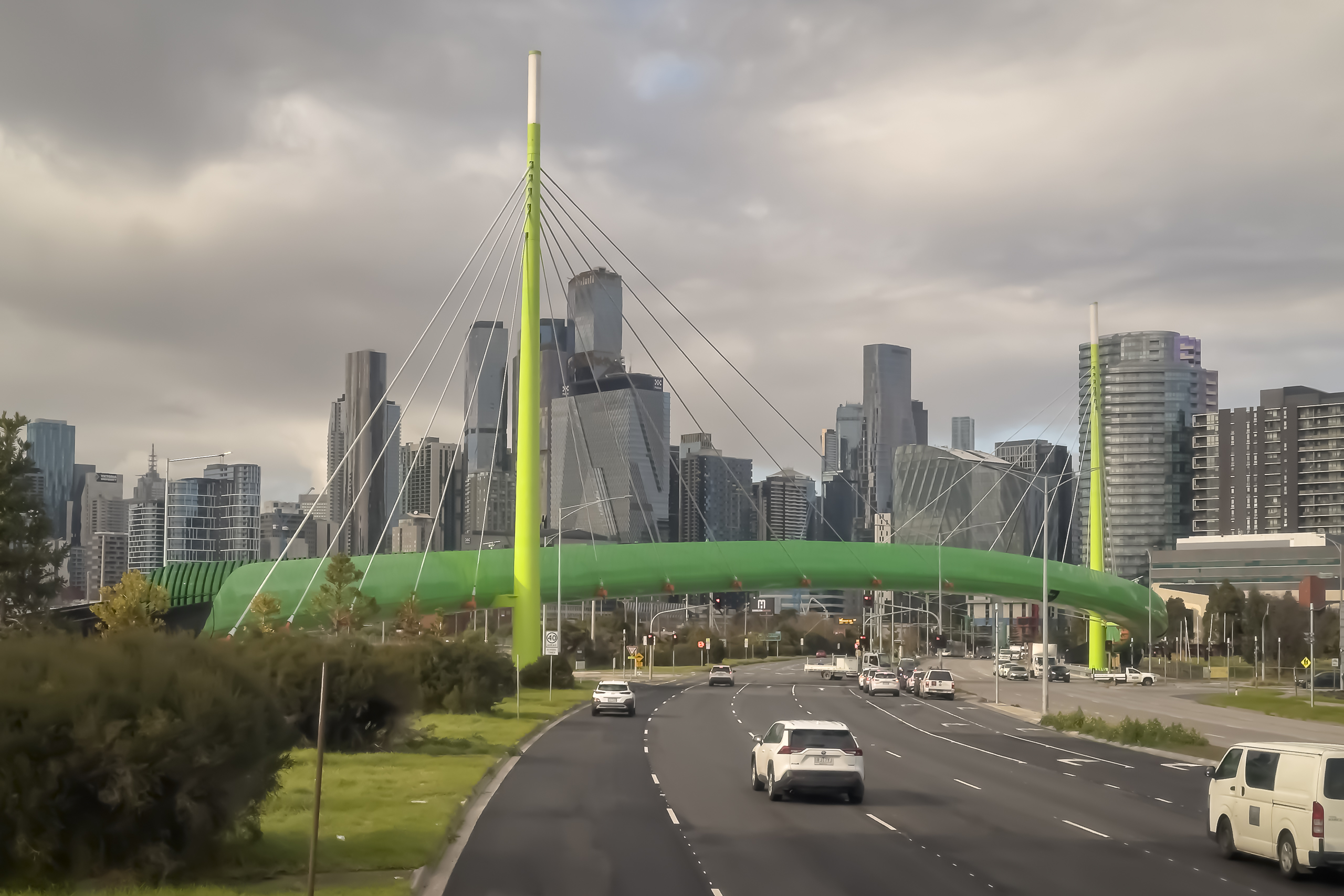 View of a city from a main road. There is a green pedestrian bridge across the highway