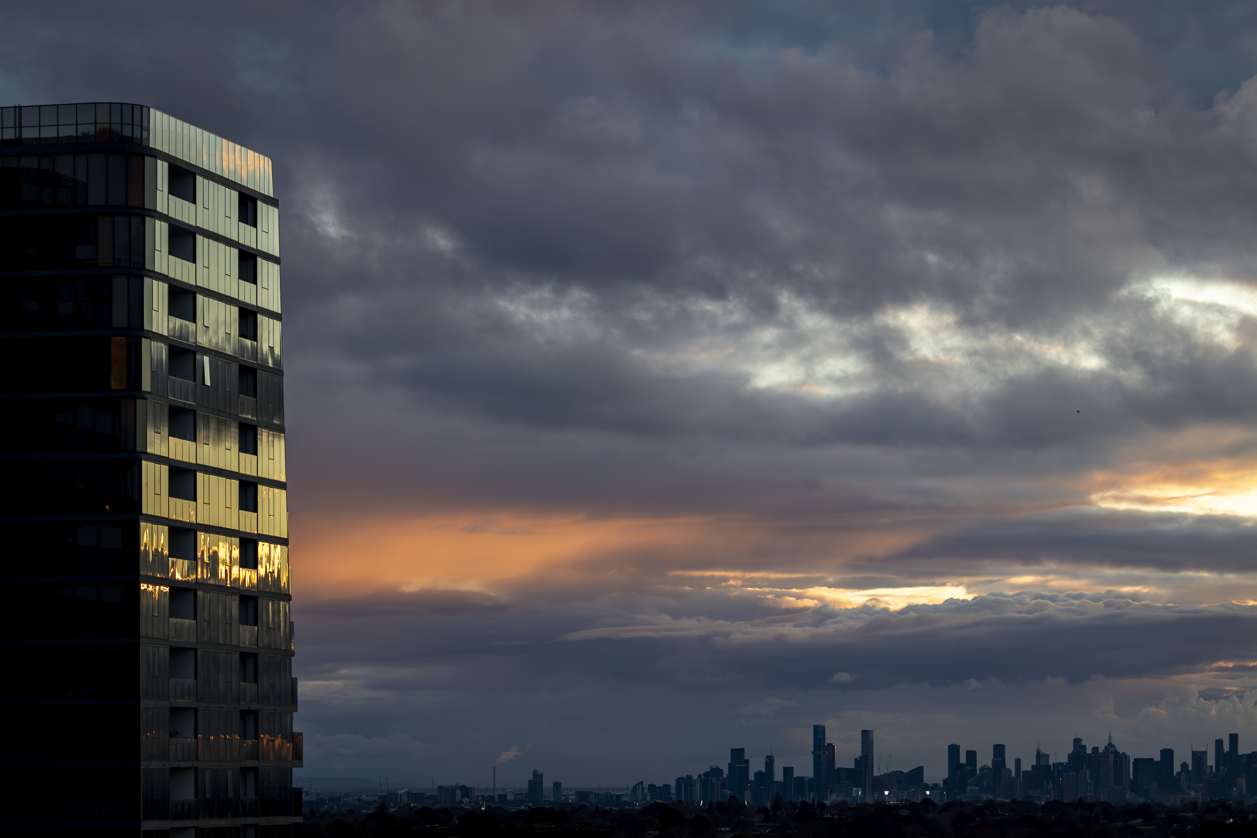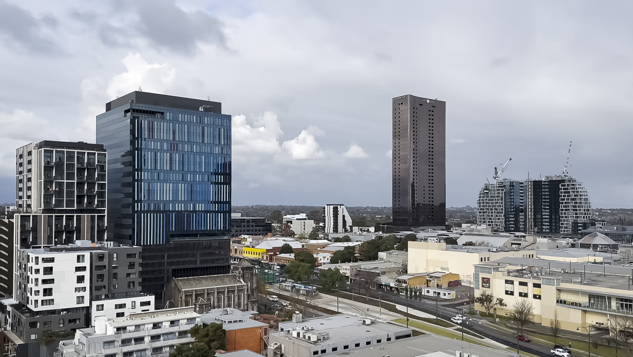 Looking out over a suburb, with a couple of high rises, from a high balcony