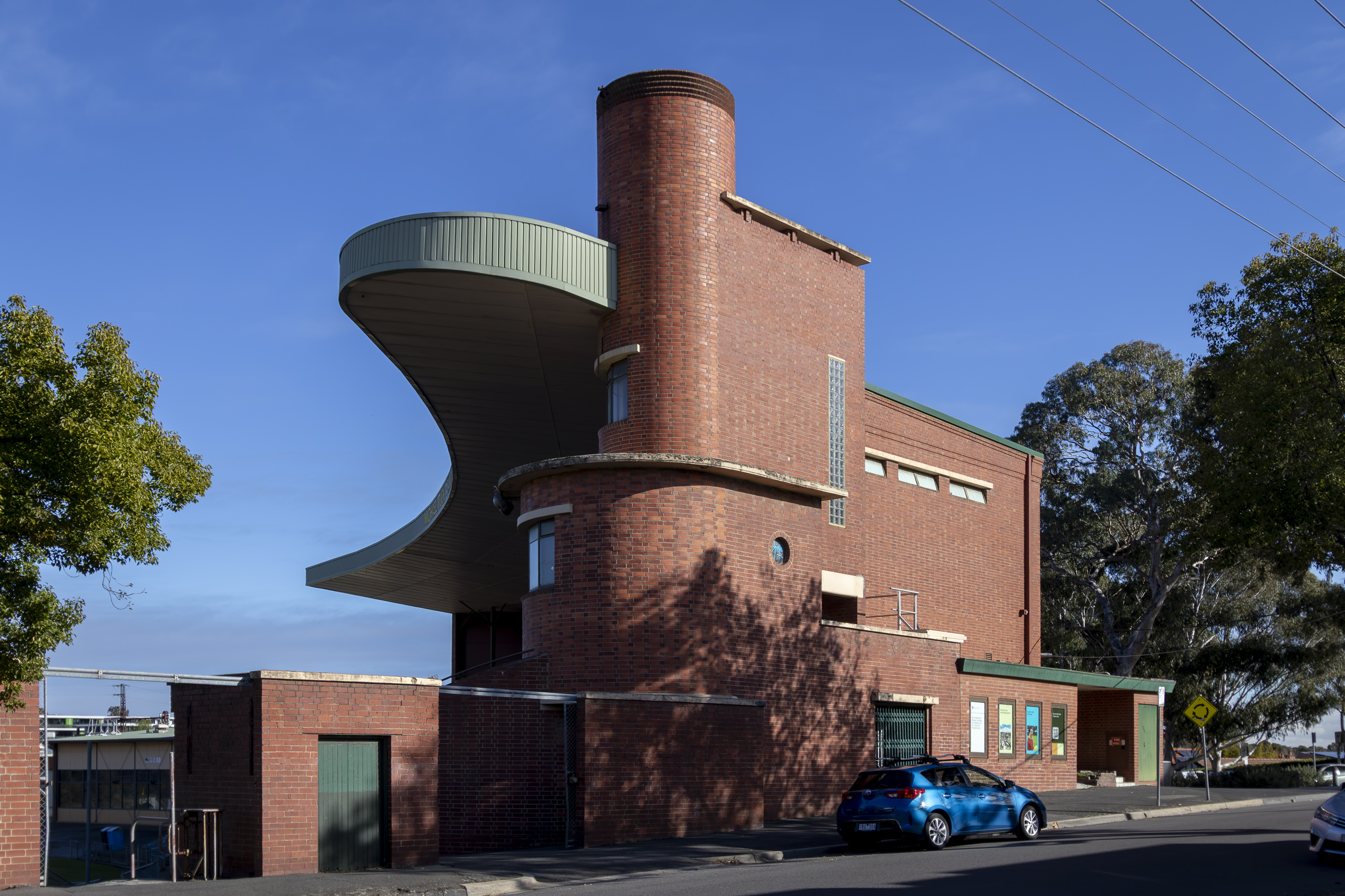 A red brick grandstand built in the art deco style, seen from the side of the street