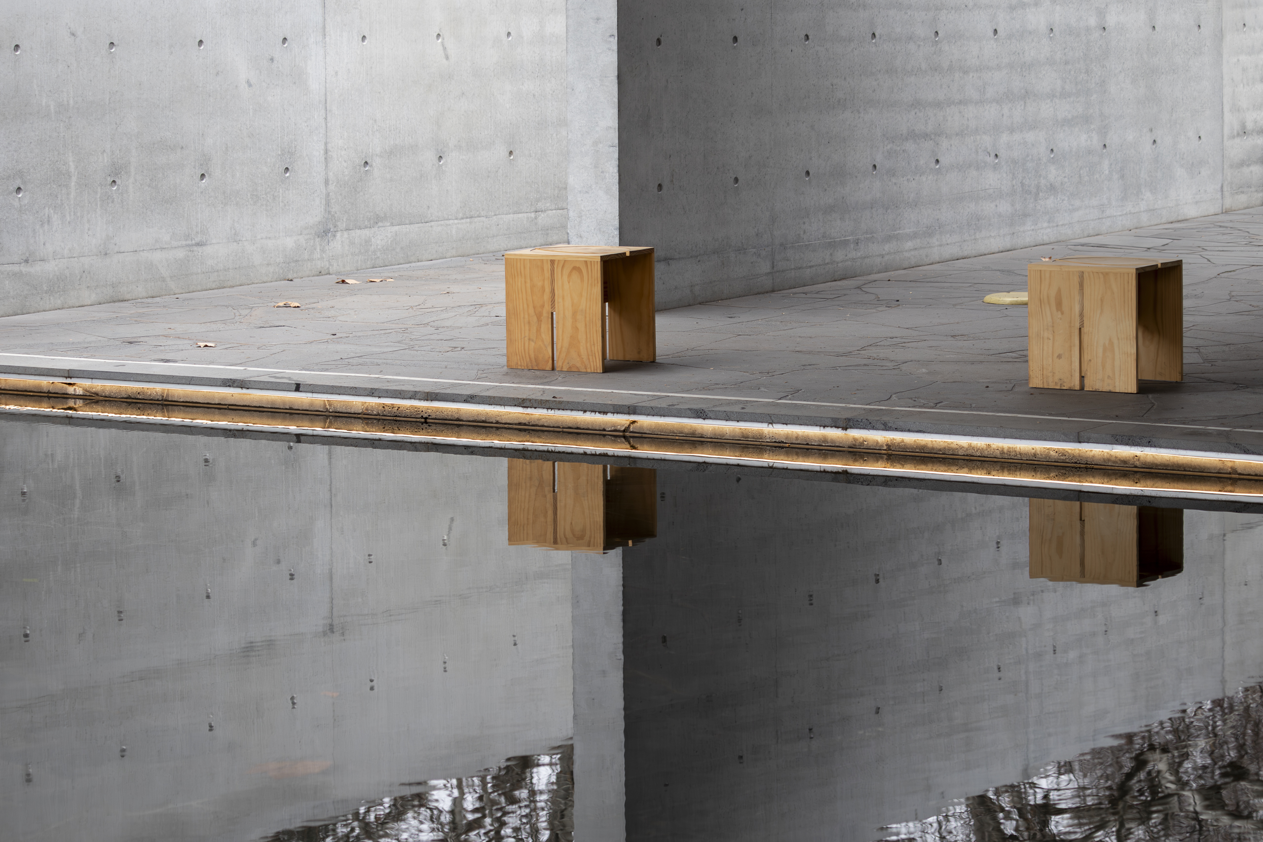 Reflections of a concrete wall and two square wooden cubes in a pool of water
