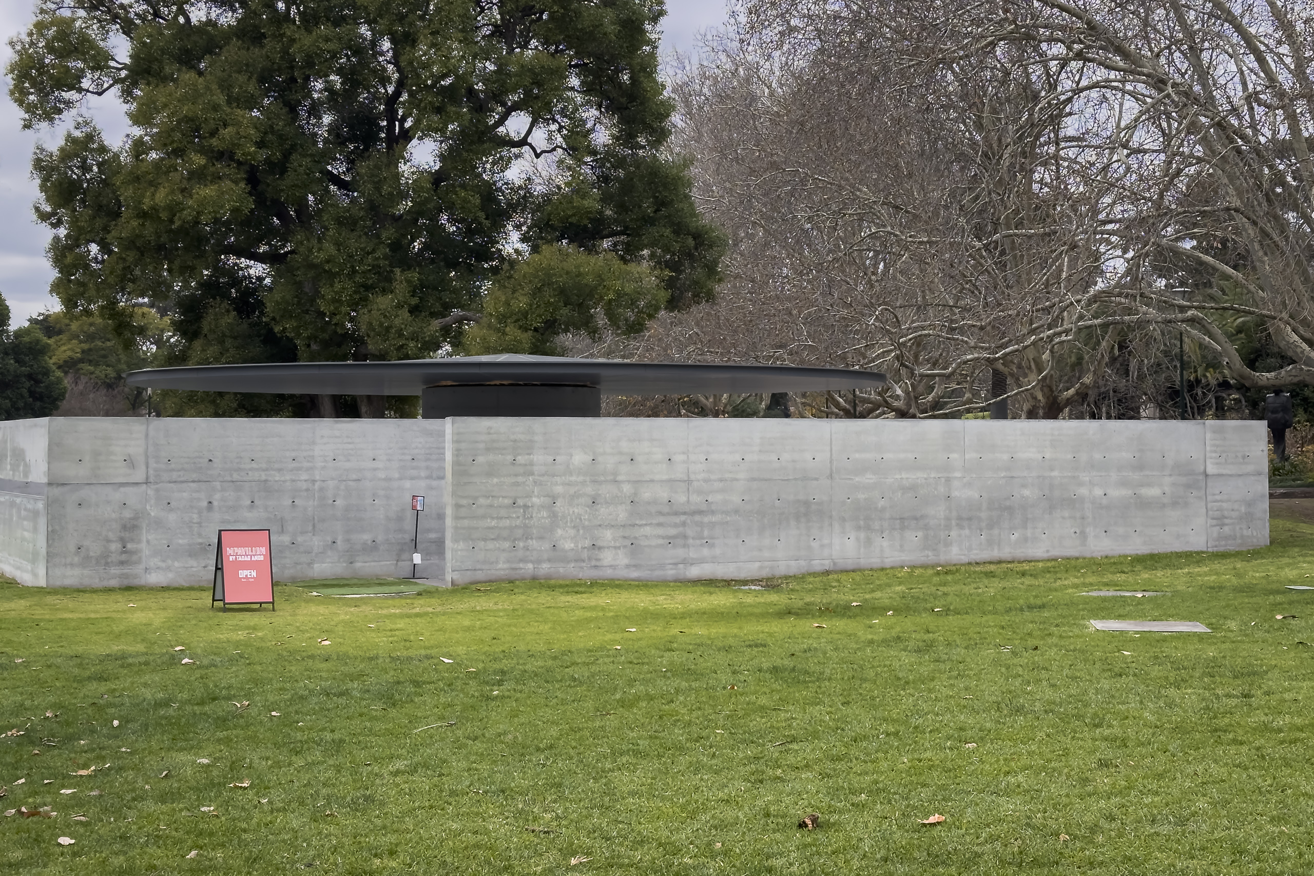 Tadao Ando’s MPavilion in the Queen Victoria Gardens, which is the tenth such pavilion to have been made under the MPavilion program in Melbourne. Under this program, each year the Naomi Milgrom Foundation commissions an architect to design a temporary pavilion for the Queen Victoria Gardens. These are then gifted to the state of Victoria.