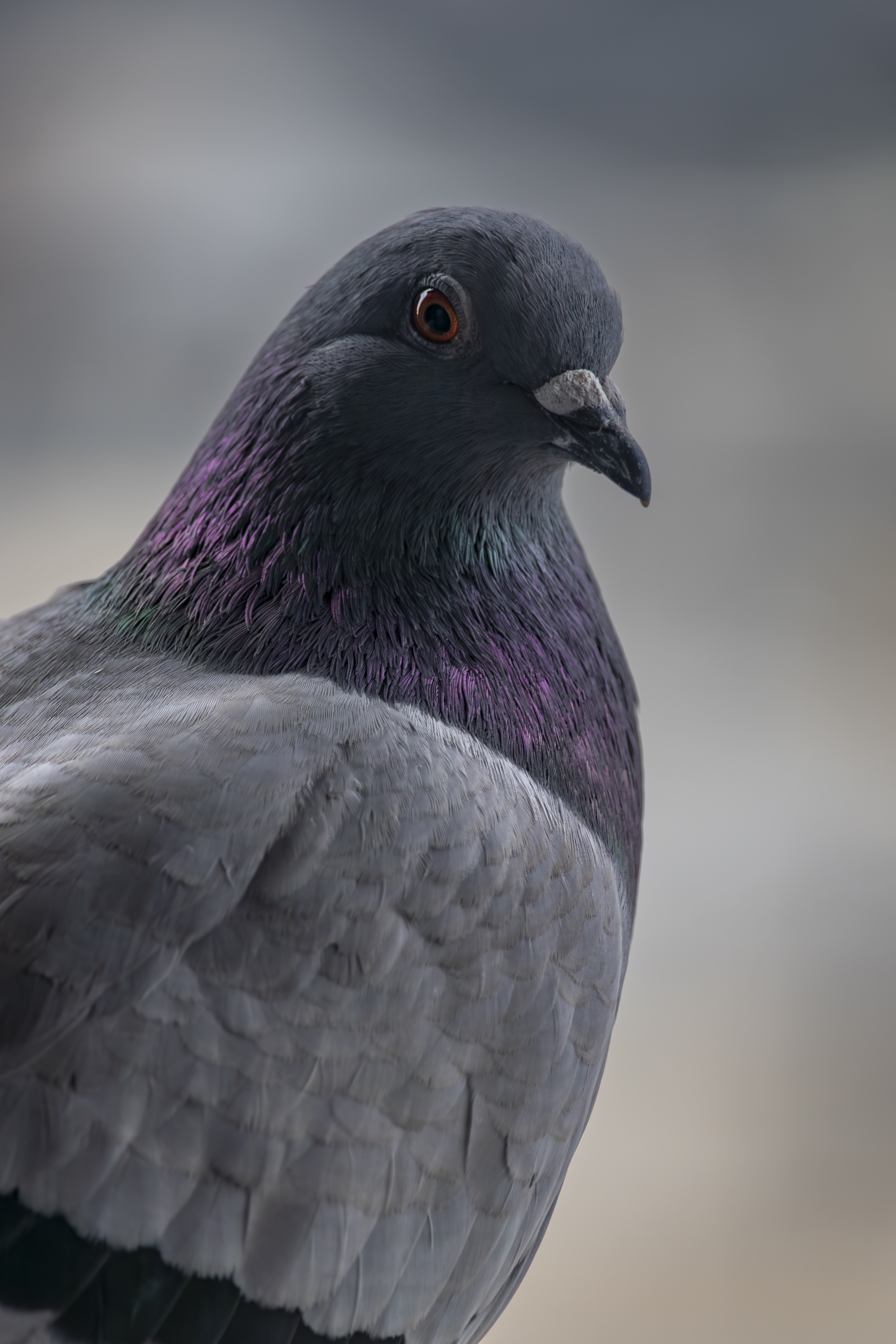 A close up of a grey pigron with pink and green feathers. Its head is turned to the right