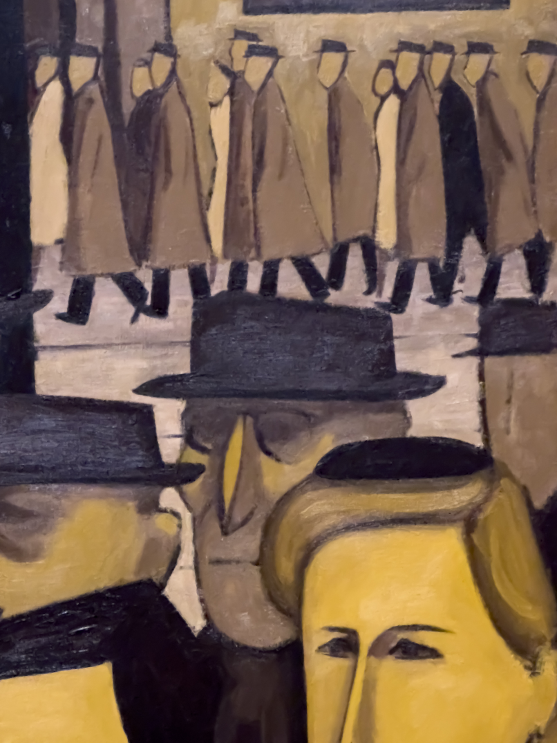 Close-up from a painting of people walking on a street. The predominant colours are brown and yellow