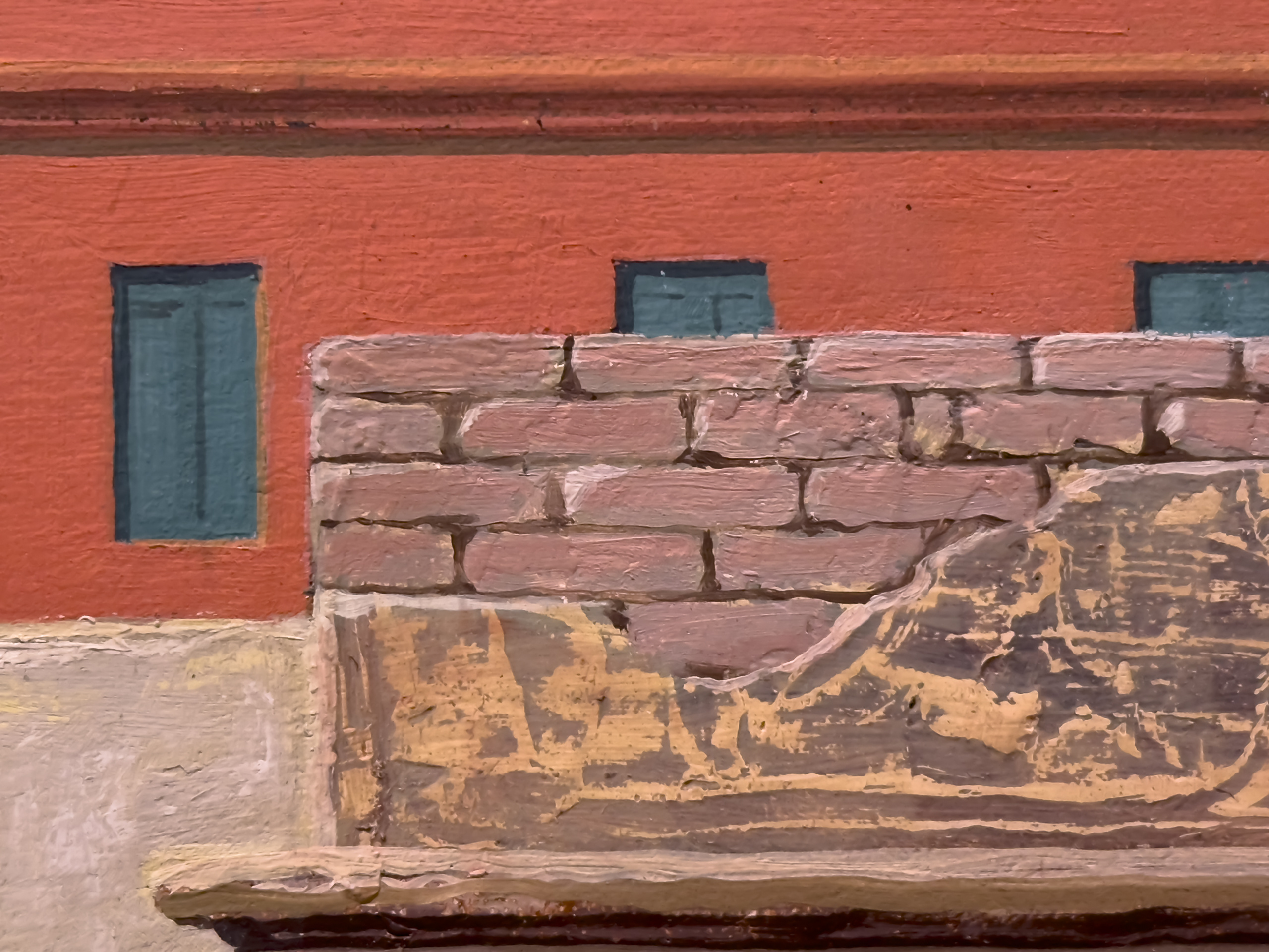 Detail from a painting that includes an orange wall in the backgruond and a brick wall in the foreground