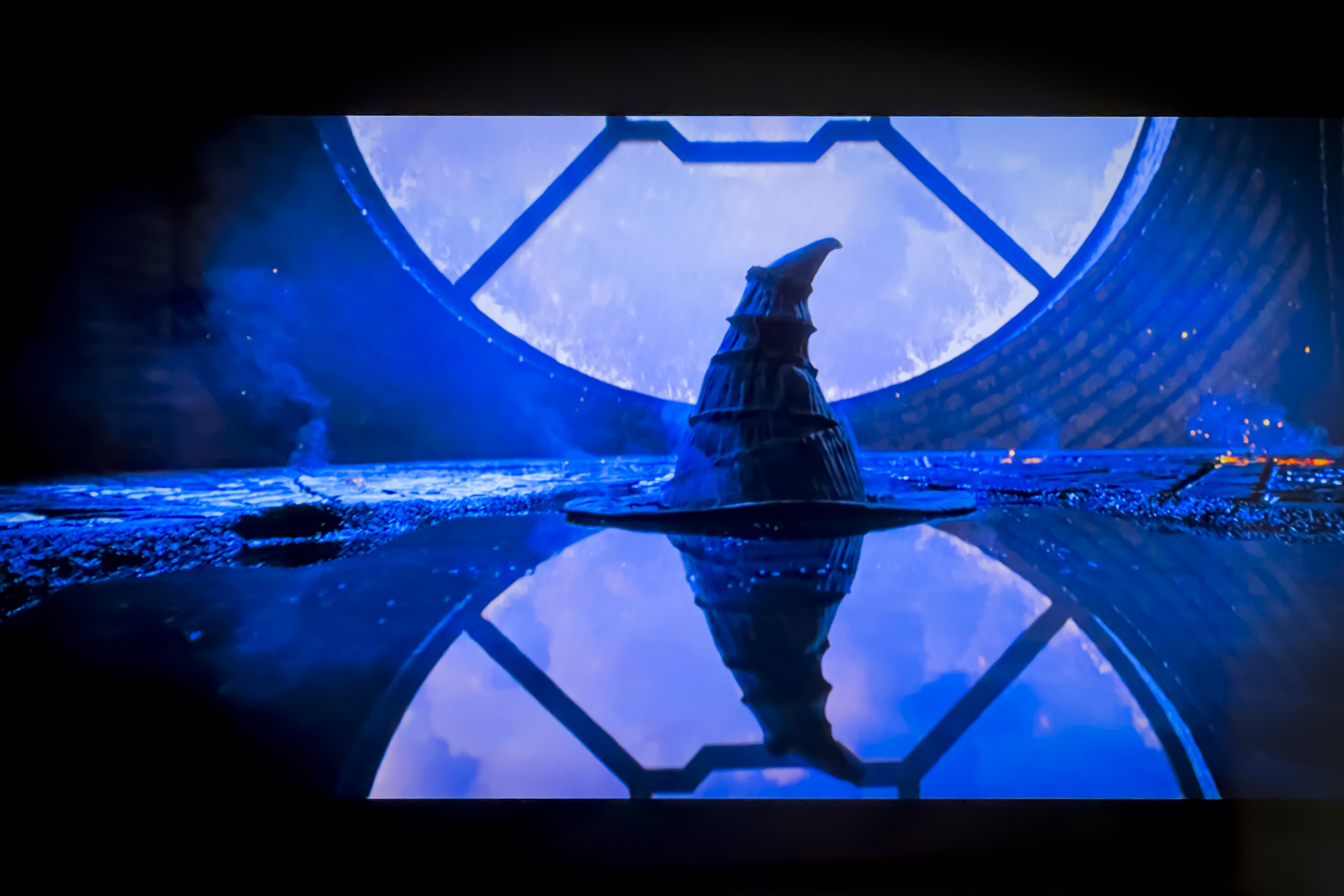 A pointy black witch's hat is reflected in a purple pool of water by a round window